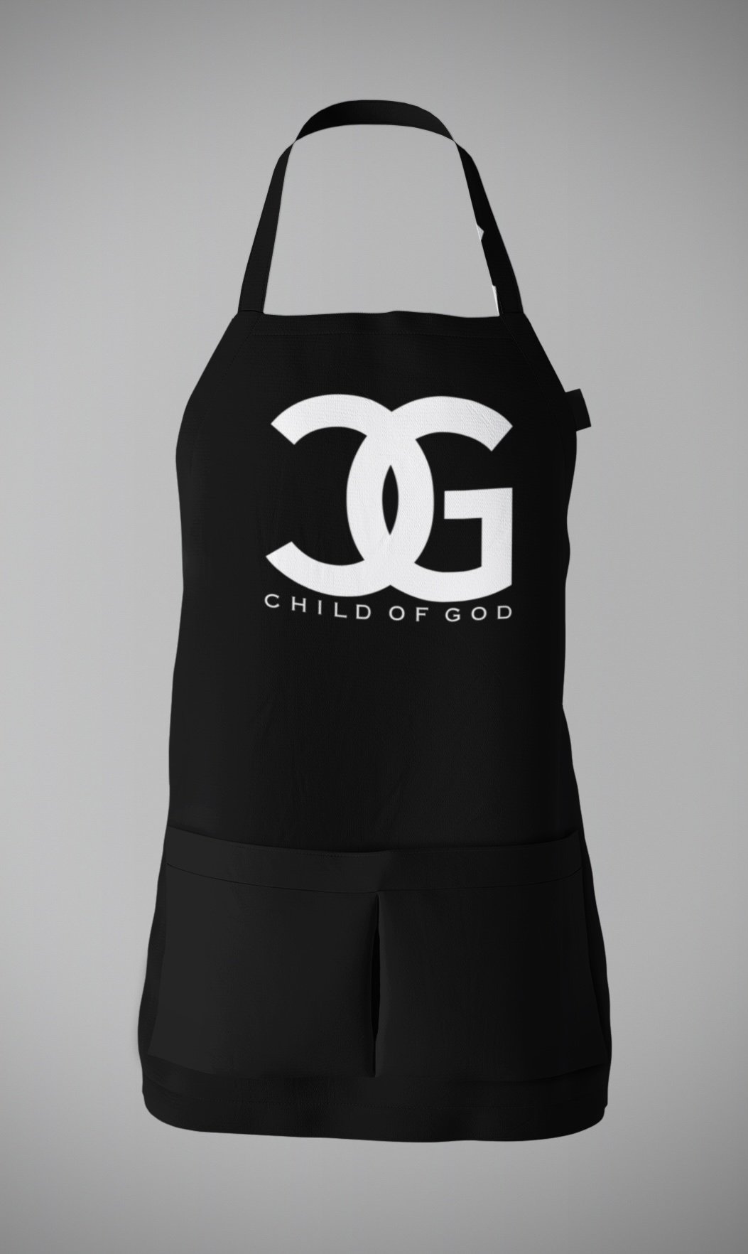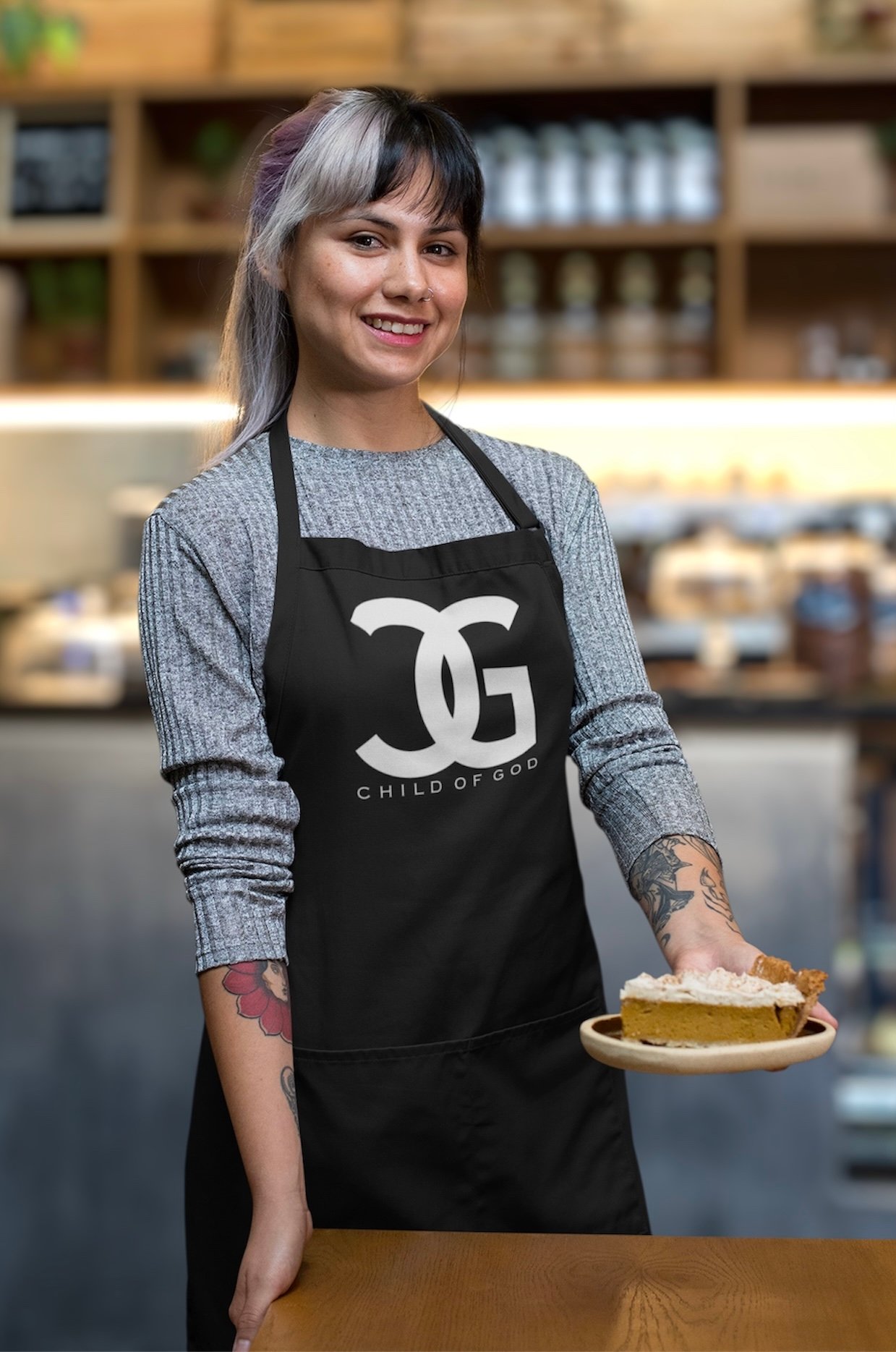 Our CHILD OF GOD -Black Apron is made from stain-resistant fabric with front pockets and our classic logo (in white) front and center. Perfect for cooking, creating, or serving with faith and style.