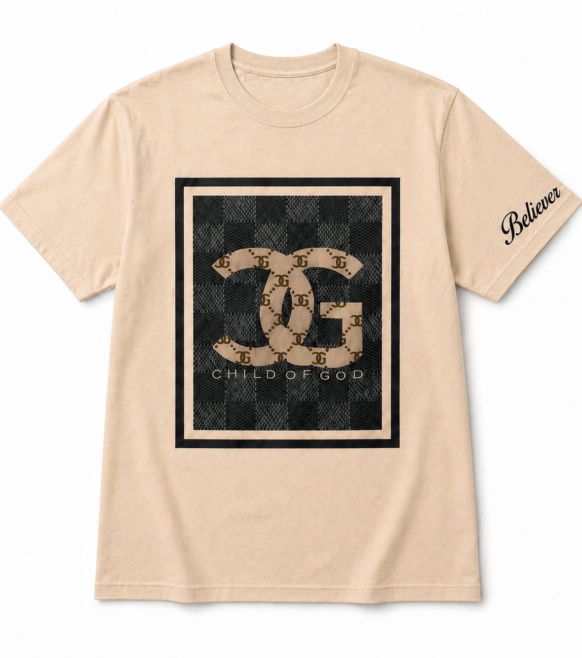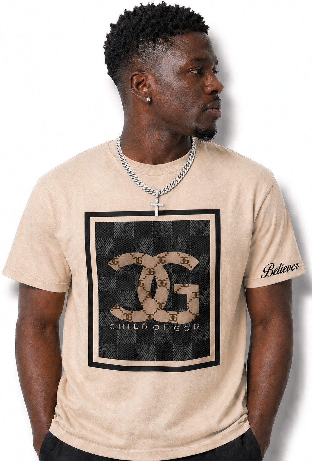 Short sleeve crewneck T-Shirt / Tan with an iconic checkerboard design surrounding our classic Child of God logo in Black with monogram pattern… it’s faith meeting, fashion meeting luxury!