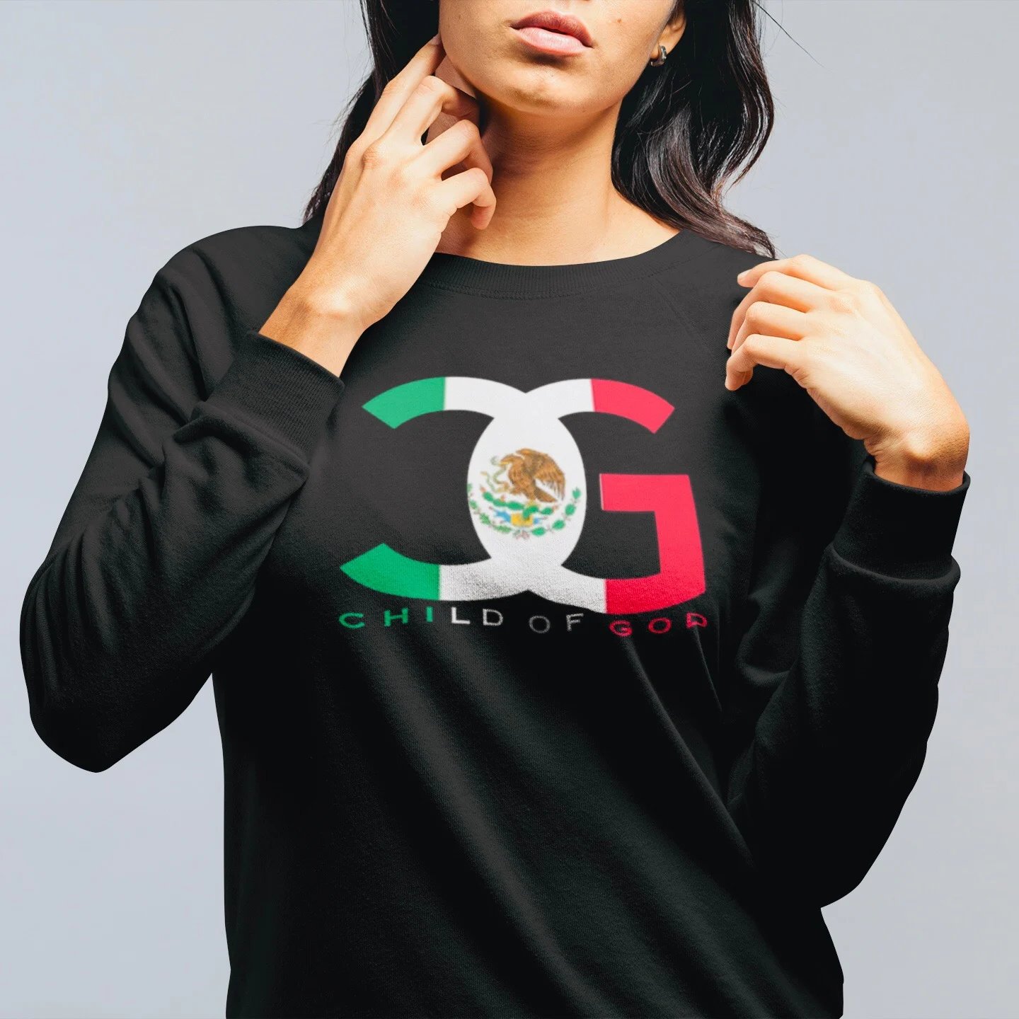 Child of God / Mexico features the iconic Mexican flag inside of our Child of God logo. This cultural and spiritual mix will be sure to turn heads. On a black unisex, long sleeve, crewneck sweatshirt. Represent your culture as spirituality!