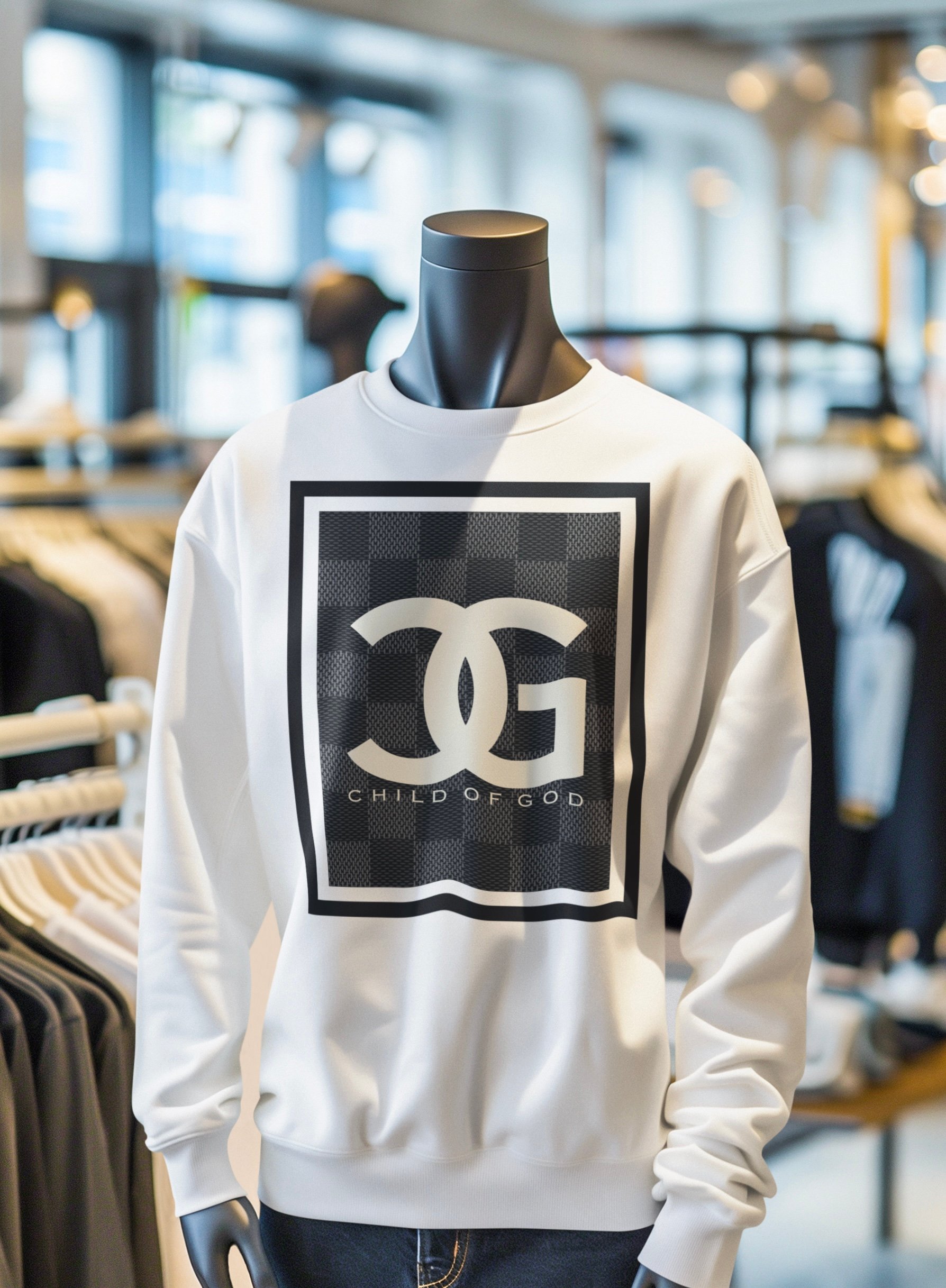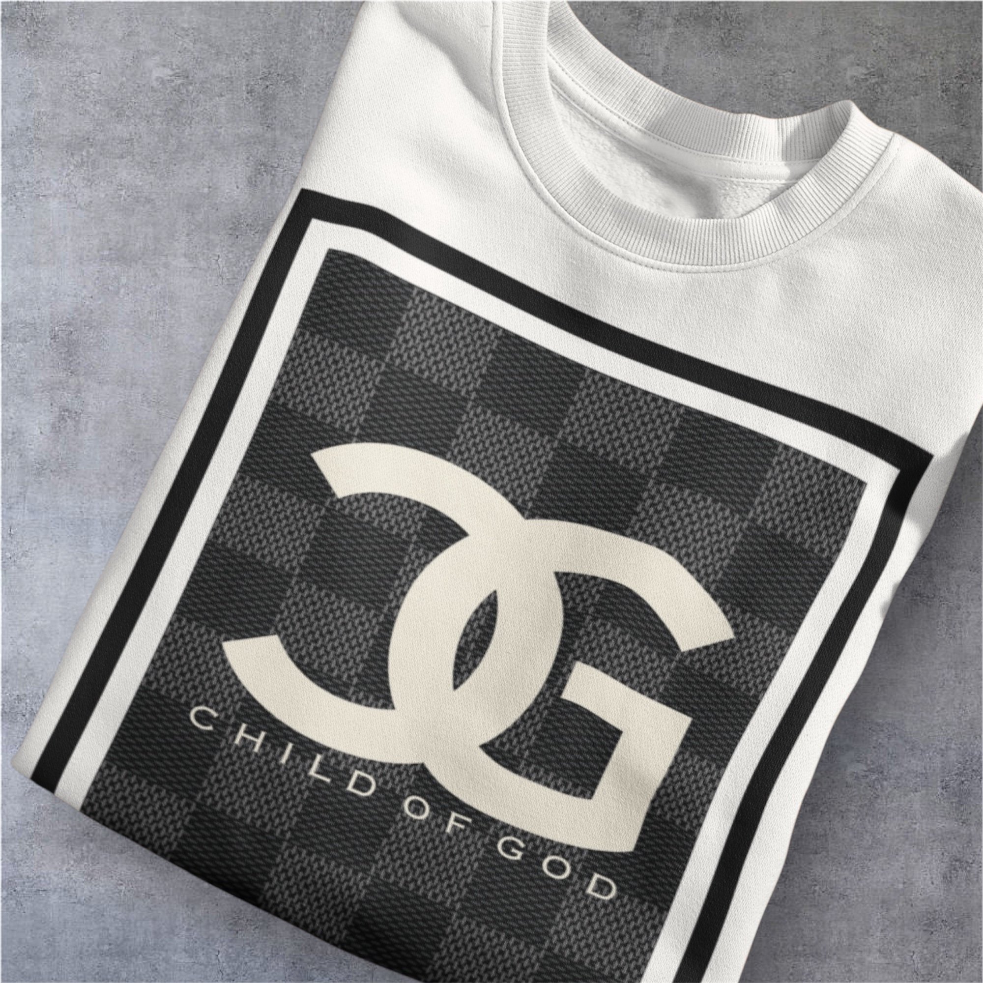 Long sleeve crewneck sweatshirt / Tan with an iconic checkerboard design surrounding our classic Child of God logo.