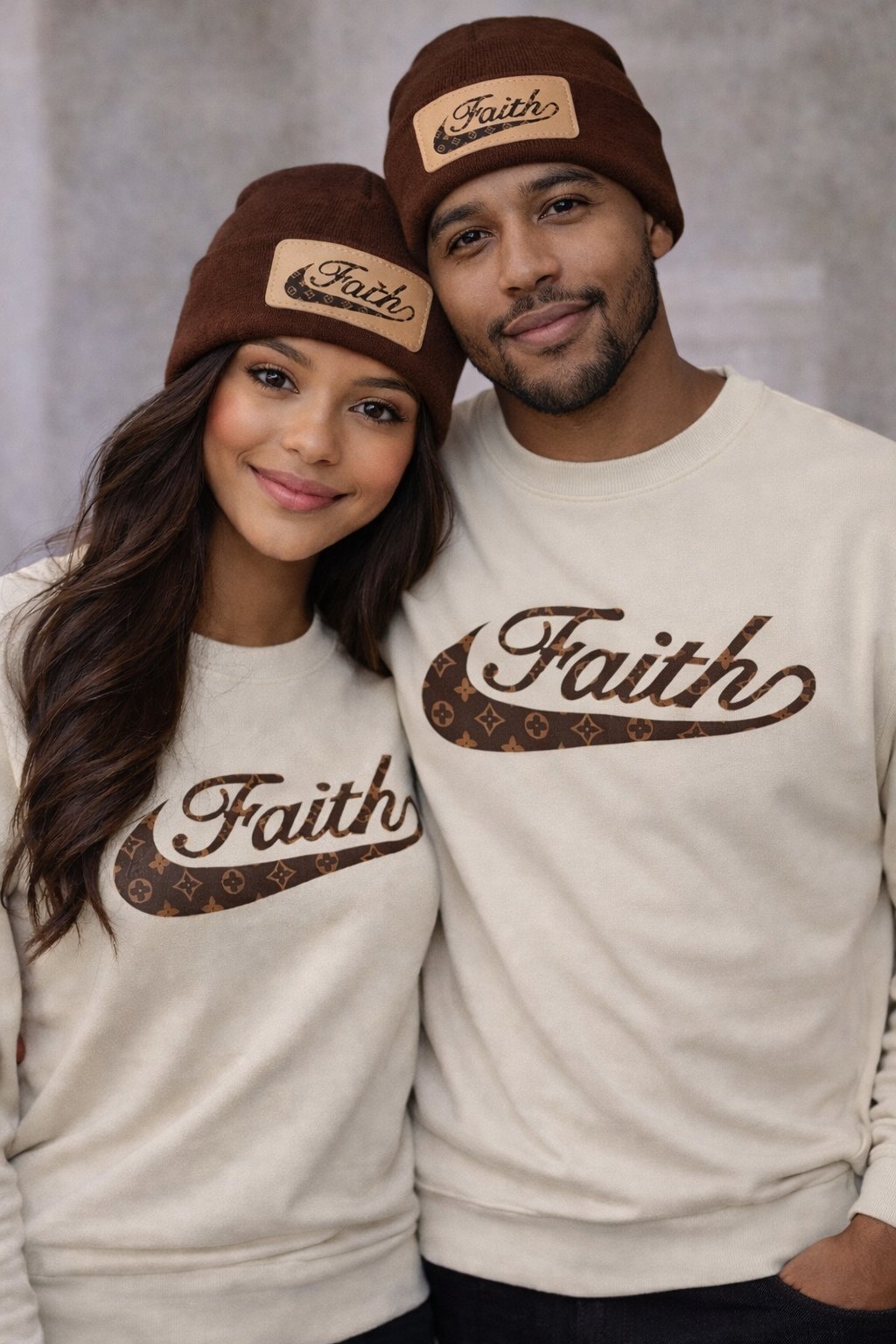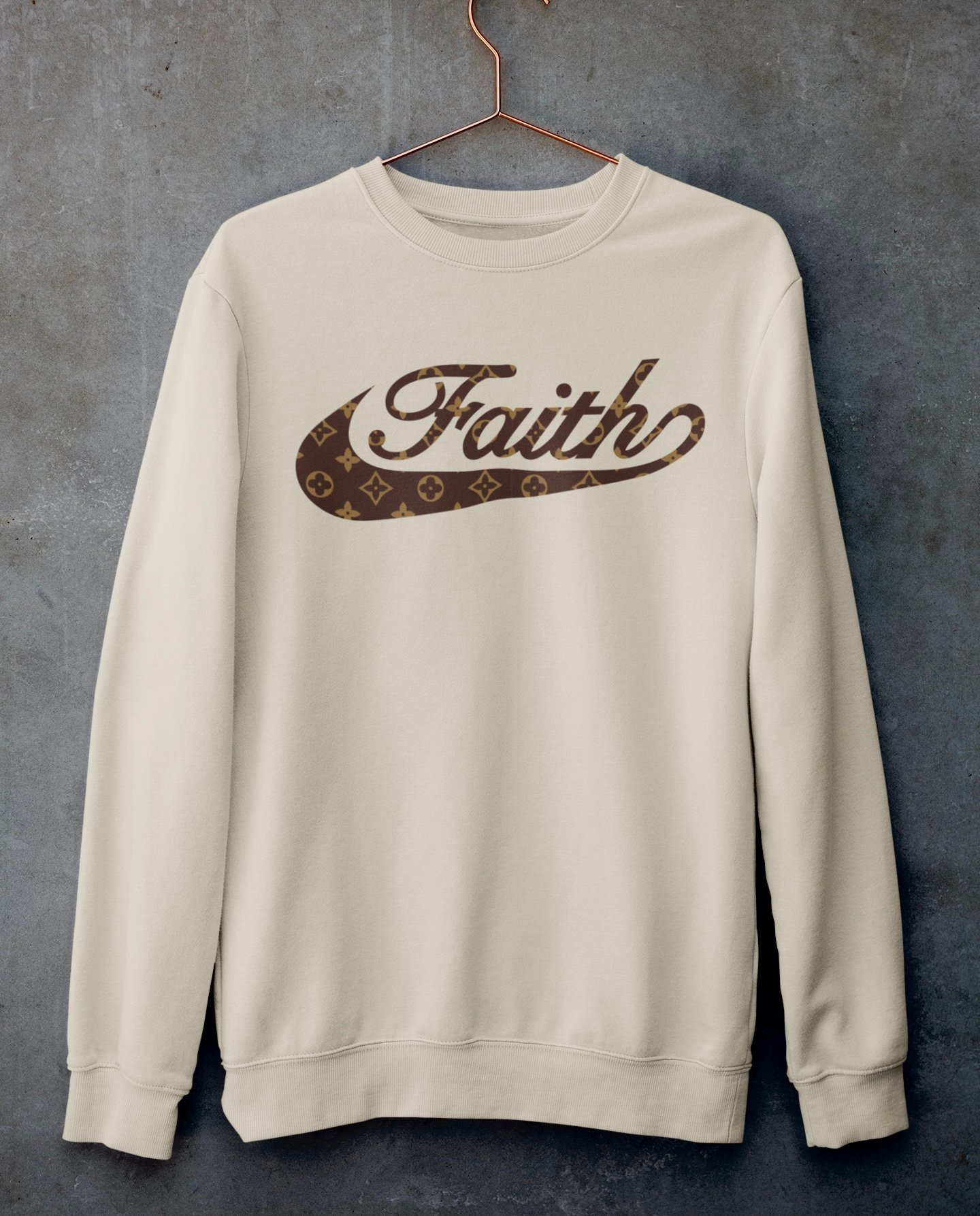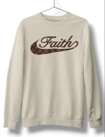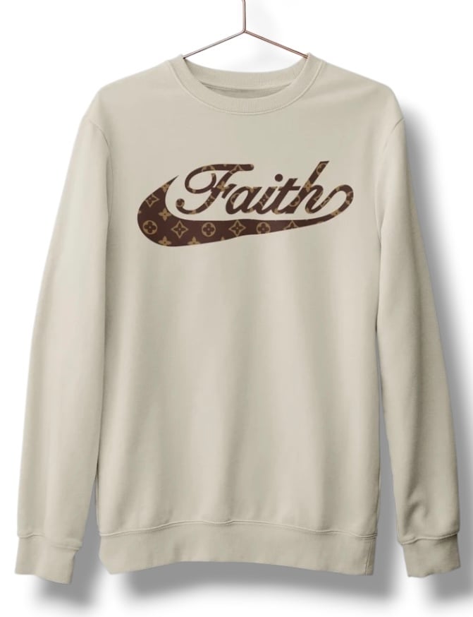 FAITH (With Pattern) Logo on a UnisexTan Long sleeve crewneck sweatshirt 80% cotton 20% polyester blend