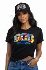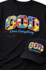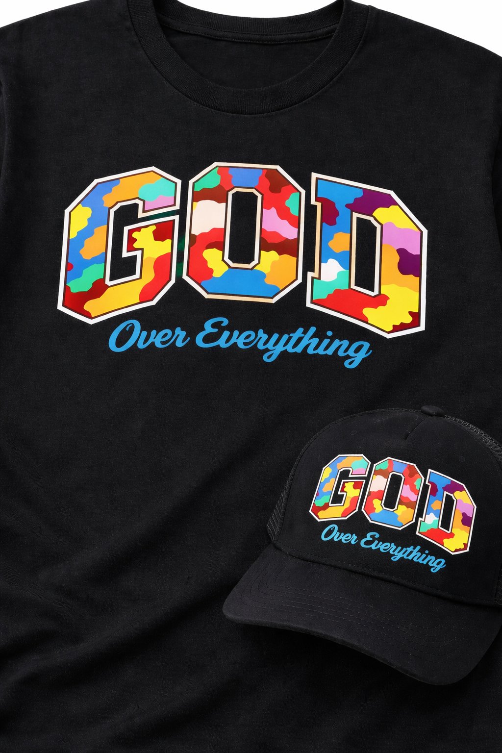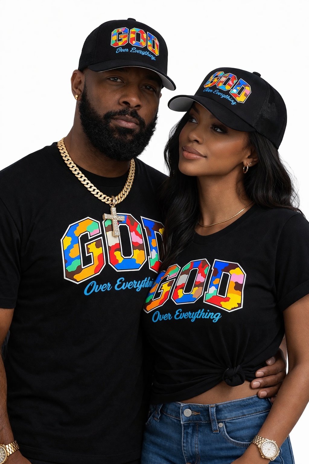 Make a bold statement of faith and style with the God Over Everything shirt and matching trucker hat set. Featuring vibrant, multicolor lettering that pops against a clean black base, this set blends streetwear energy with a powerful message. The crisp “Over Everything” script adds a smooth, elevated touch, making it perfect for everyday wear or standout moments.