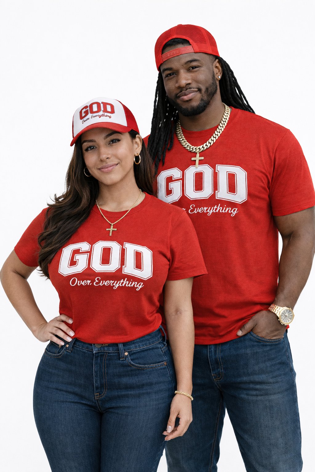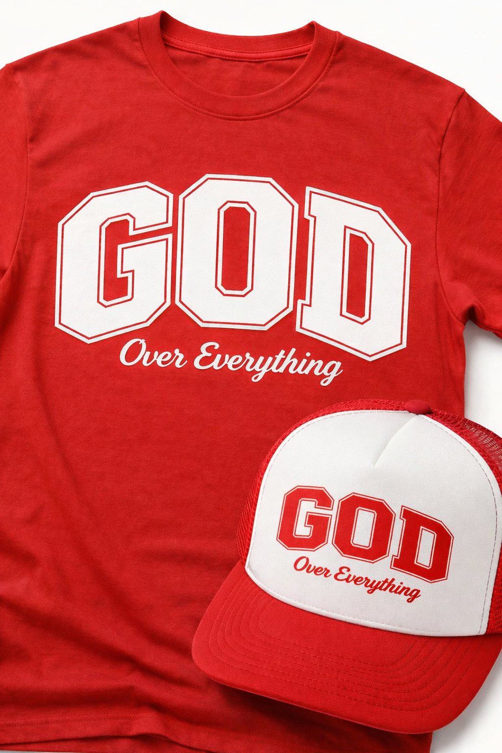 Bold faith meets everyday streetwear. This matching red tee and trucker hat set features the standout “GOD Over Everything” design in crisp white, making a powerful statement without saying a word. Built for comfort and style, the breathable mesh-back hat and soft premium tee deliver an effortless fit whether you’re out or laid back.